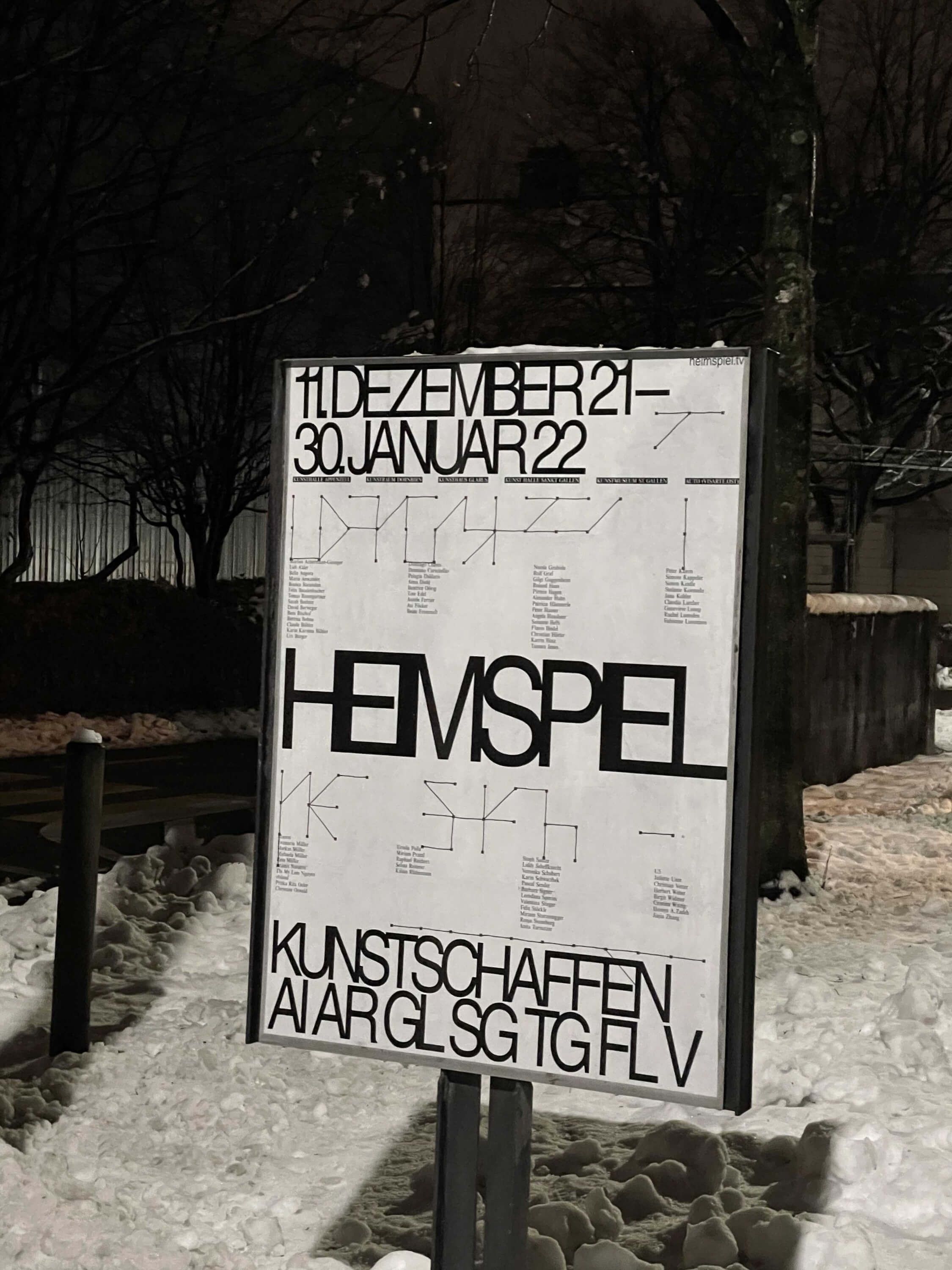 Heimspiel 2021 was a cross-border exhibition collaboration in contemporary visual arts, taking place every three years in the border region of Switzerland, Vorarlberg, and Liechtenstein. The exhibition was held at several venues, including Kunstmuseum St. Gallen, Kunst Halle Sankt Gallen, Kunstraum Dornbirn, Kunsthalle Ziegelhütte in Appenzell, and Kunsthaus Glarus. With Aurelia Peter.